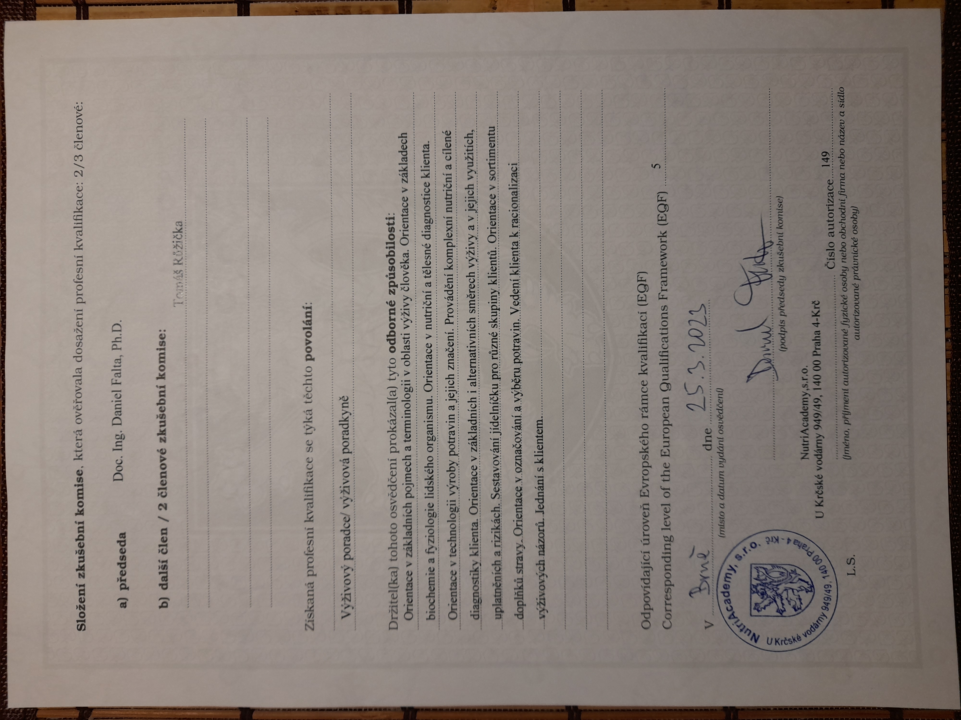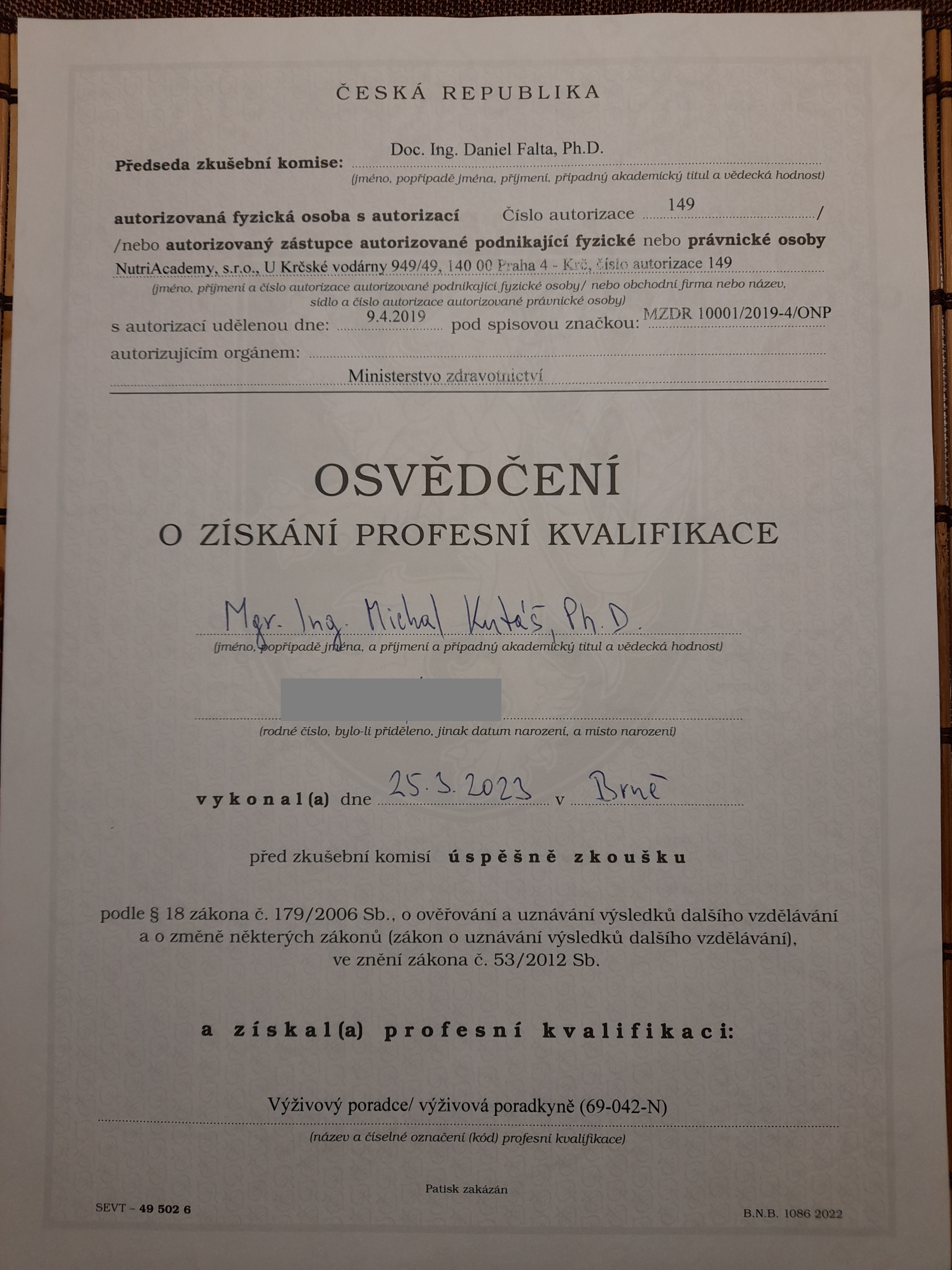 Michal Kutáš - Osvedčenie o získaní profesijnej kvalifikácie 69-042-N Výživový poradca
