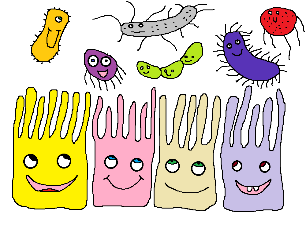 Máme vo vašom brušku ďalších dobrých priateľov a sú nimi vaše bunky a ich verní poslovia, hormóny a iné dôležité bielkoviny. Veľa sa s nimi zhovárame, spolu dohliadame na vaše črevo a usilovne sa staráme o to, aby bolo celé vaše telo zdravé a spokojné. Vytvárame pre vás rôzne dôležité látky, ktoré potrebujú vaše črevné bunky, aby boli šťastné. Pomáhame im dokonca aj s výrobou zázračného elixíru, serotonínu, vášho hormónu šťastia! My mikróbiky z čreva si navyše neustále telefonujeme s riadiacim centrom, vašim mozgom, ktorý tiež potrebuje našu výpomoc. Ja a moji kamaráti sme pre vás jednoducho mimoriadne dôležití. A všetci túžime po tom, aby ste vy, deti, boli stále veselé a usmiate.